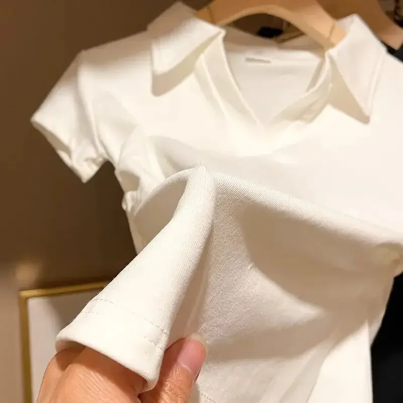 White Polo Short Sleeve T-shirt Women’s Summer New Style Waist-fitted Slimming Casual Versatile Fashion Top For Women